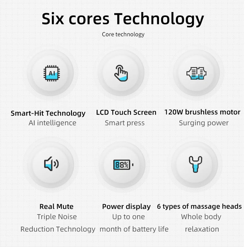 - Includes 6 interchangeable heads for full-body muscle relief and recovery.
